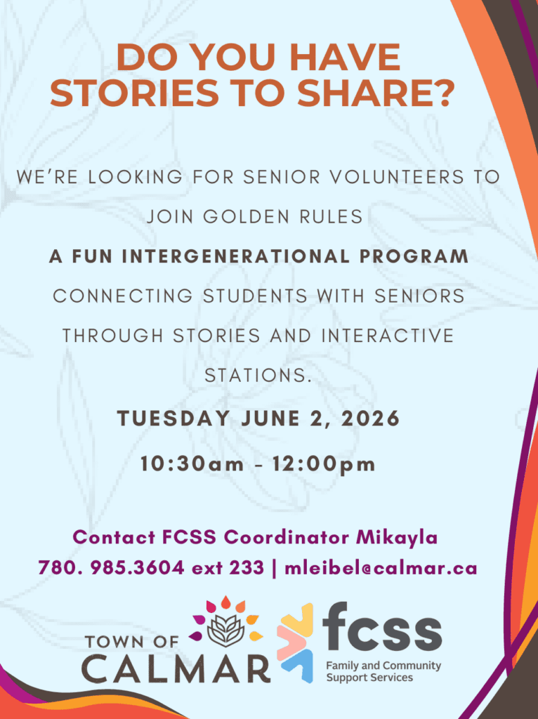 FCSS is looking for senior volunteers to take part in a Golden Rules Session on Tuesday, June 2 10:30am – 12:00pm at the Calmar Elementary School. Golden Rules is an intergenerational program designed to bring generations together through interactive stations, stories, and shared experiences. This is a fun and meaningful opportunity to connect, share memories, and help younger generations discover what life was like growing up years ago.