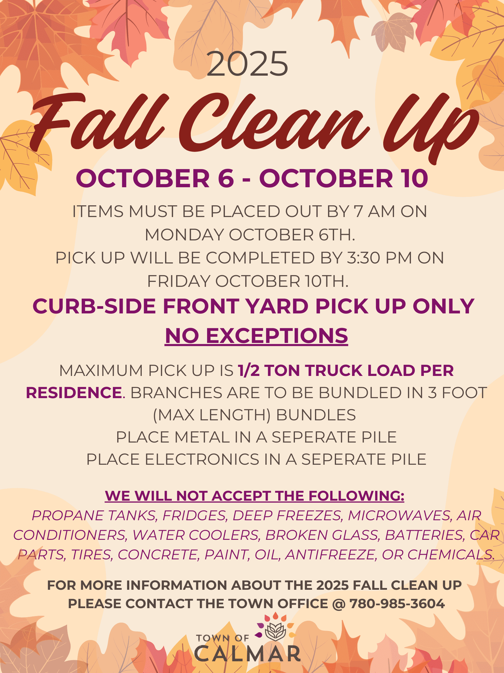 Date Oct 06 - 10 2025 Expired! Time 7:00 am - 3:30 pm Fall Clean Up 2025 Fall Clean Up 2025 October 6 to 10 For Details: See Flyer Share this event + Add to Google Calendar + iCal / Outlook export