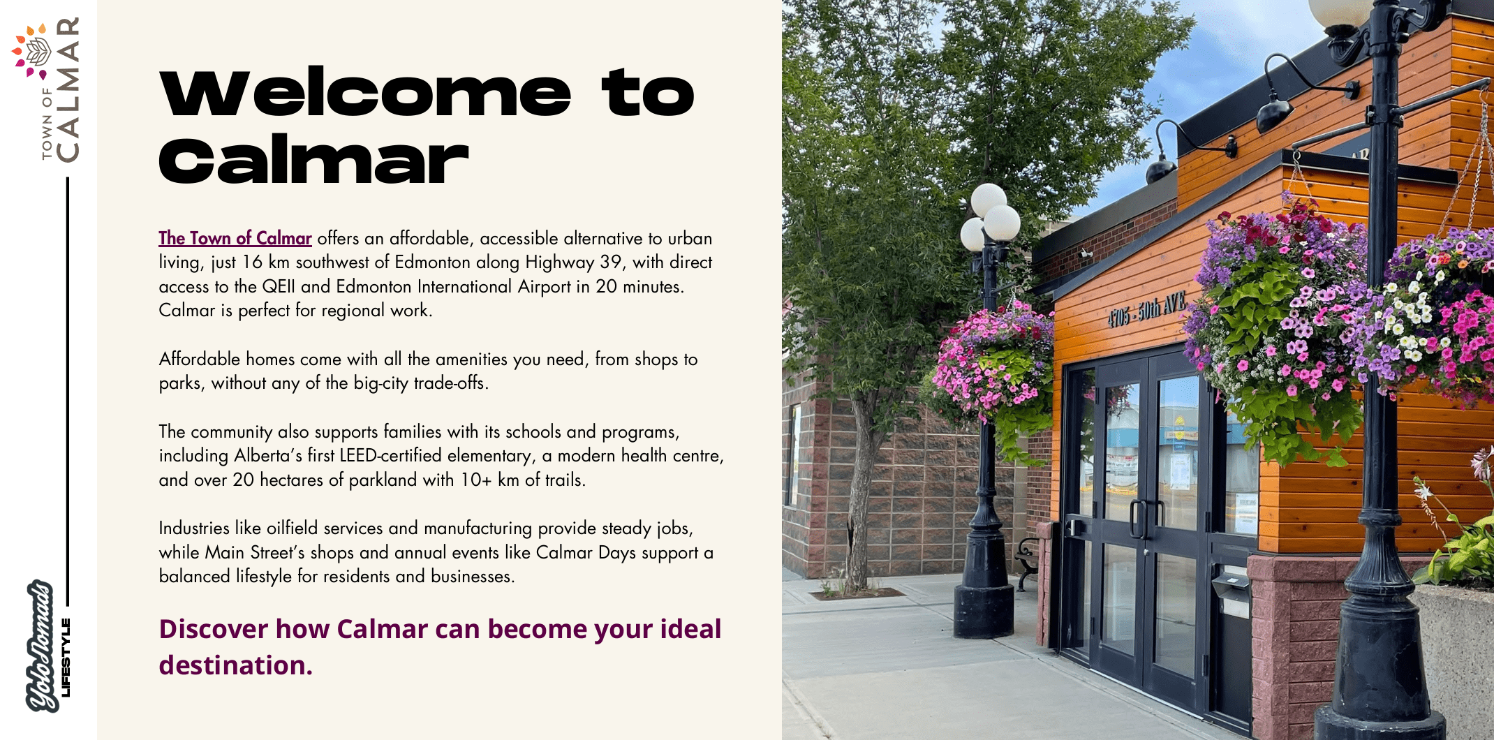 We moved to Calmar, as we found a house that was barrier free wheelchair accessible. My partner suffered a stroke on January 23rd. We lived in Sherwood Park prior but our house at that time was not suitable! We are very familiar with Calmar as we used to have a trailer in Drayton Valley. We travelled through the town many times. We stopped often at the bakery, ice cream shop, bottle depot, gas stations, etc. We are loving this town and we both find the people very nice. A visit from the mayor really took us back, what a wonderful surprise. I am sure we will only love it more in time. Thank you for the warm welcome!!!